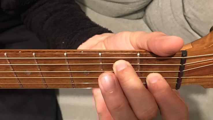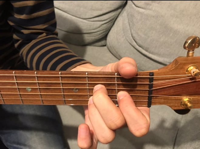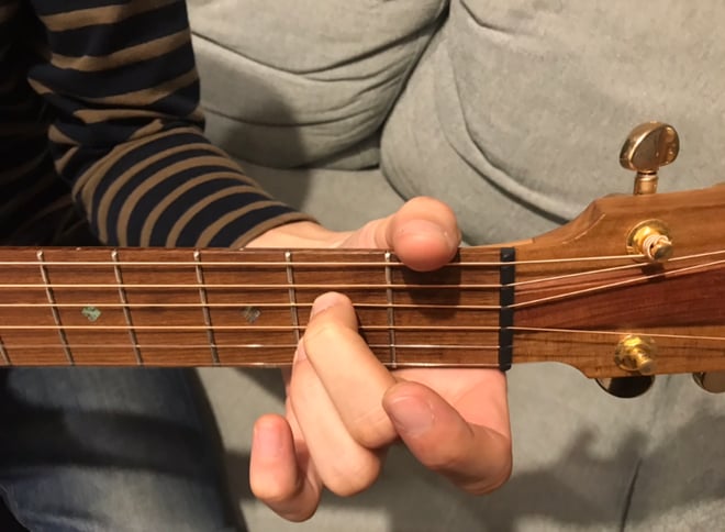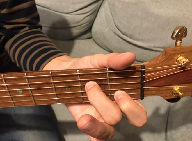 5弦2フレットを中指で押さえて弦を全て弾くだけで成り立つコードです!