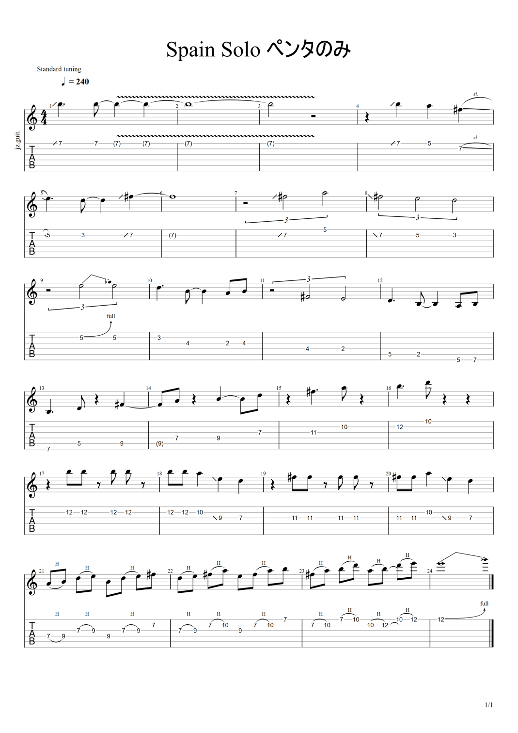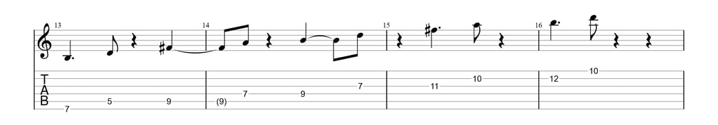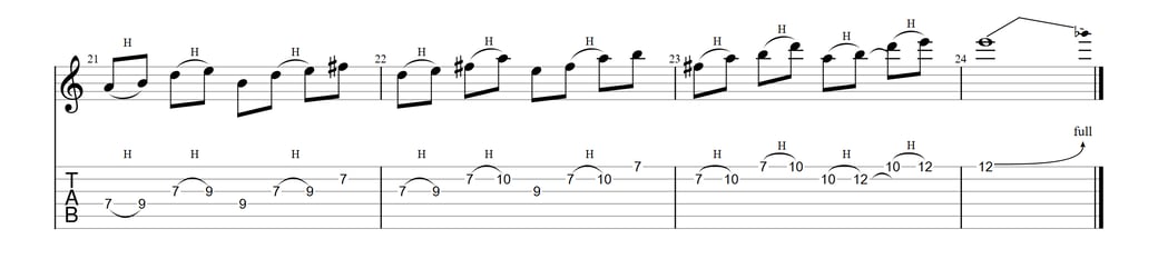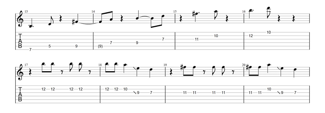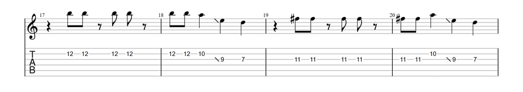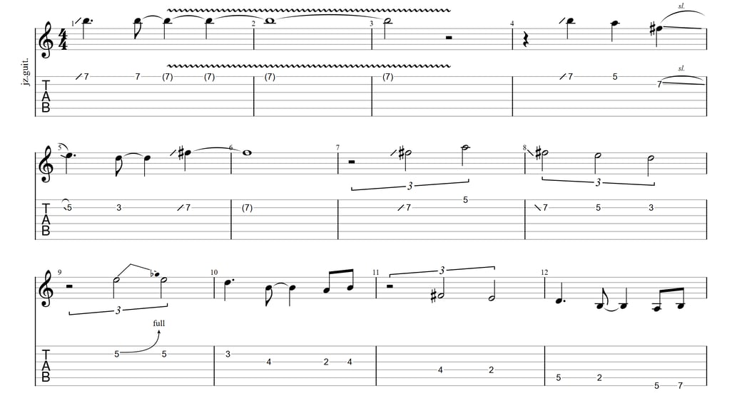 以下がフレーズ例(1小節目から12小節目等)※この場所以外にもスライドやチョーキングが使われております