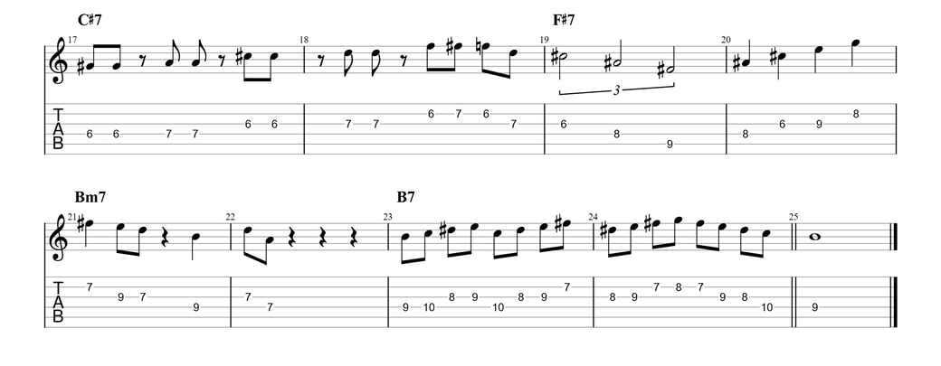 19小節目からのF#7の所はコードトーンを多めにして弾くことで安定したサウンドのアドリブが演奏できます