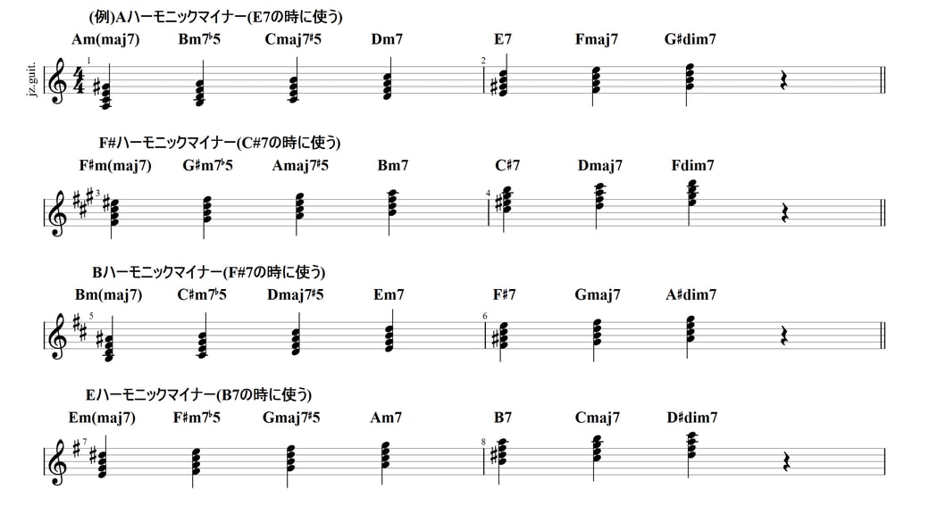 ポイントは、対象の7thコードに対して、5度下のハーモニックマイナースケールを使うこと