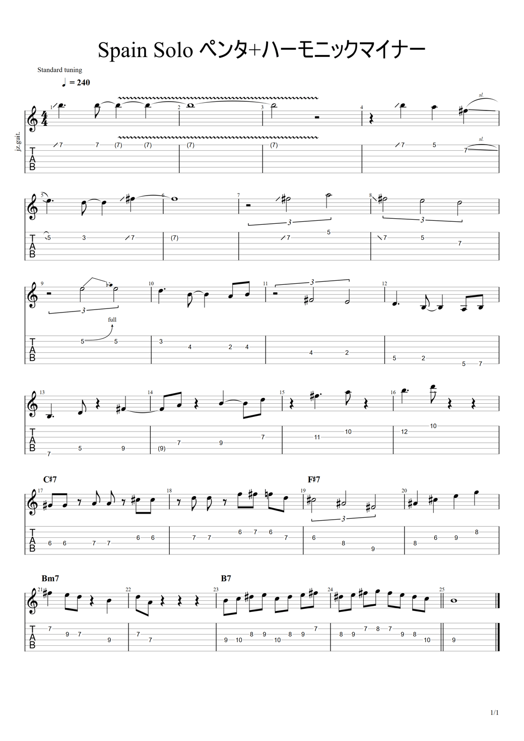 今回は前回使ったペンタのフレーズの後半にハーモニックマイナーのフレーズを入れてみました(17小節目から)